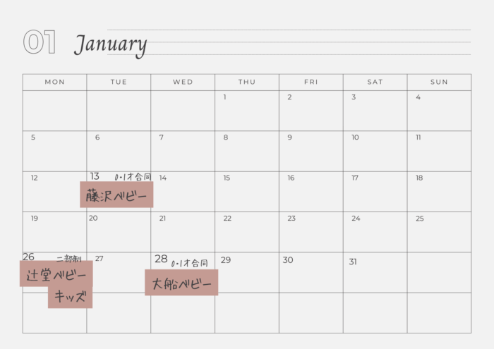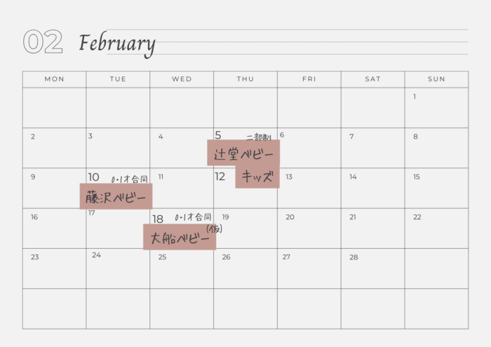 以下の日程はいずれも二部制で開催します。9:50-10:30にベビークラス、10:50-11:30にキッズクラス2026/2/5(木)【和室】